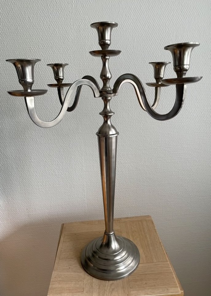 Juhlava, jämäkkä ja hienostunut pöytäkynttelikkö, 50 cm korkea,uutta vastaava (hinta neuvoteltavissa). Vain nouto.